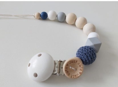 Met dit houten speenkoord gecombineerd met siliconen en gehaakte kralen in de kleuren donkerblauw, grijs en marmer komt je kleintje hip voor de dag.
